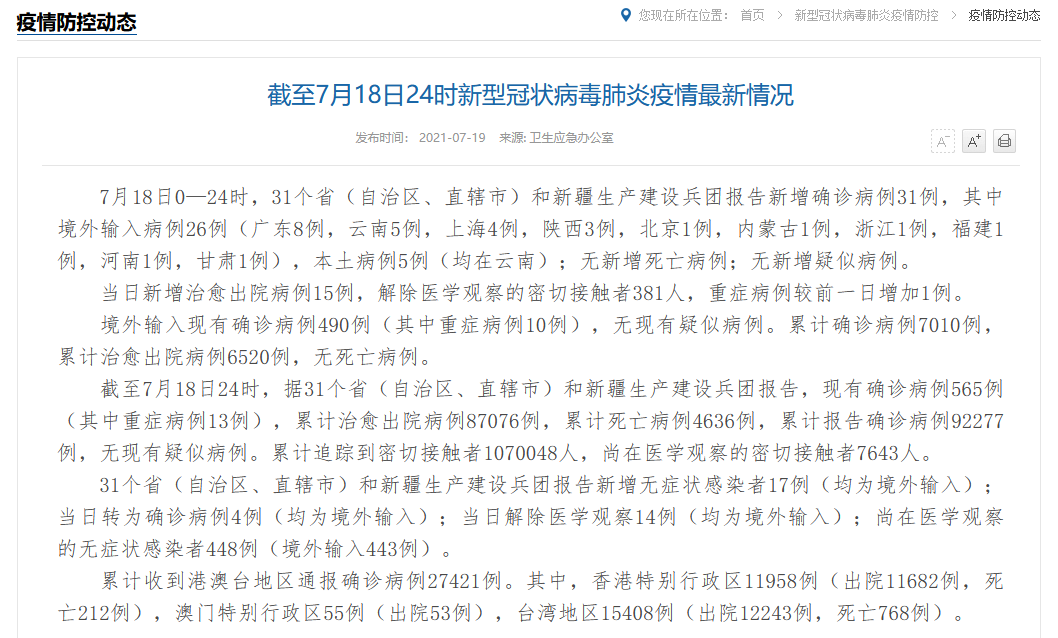 截至11月19日24时,据31个省(自治区、直辖市)和新疆生产建设兵团报告 ,现有确诊病例20829例(其中重症病例95例),累计治愈出院病例260141例,累计死亡病例5227例,累计报告确诊病例286197例 ,无现有疑似病例 。累计追踪到密切接触者10002167人,尚在医学观察的密切接触者1105680人。