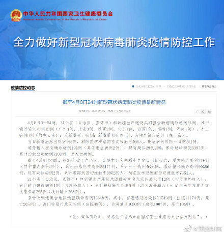 新增确诊:叁壹个省(自治区、直辖市)和新疆生产建设兵团报告新增确诊病例贰壹例,其中湖北壹例(武汉壹例),境外输入贰0例(北京9例 ,上海叁例,广东叁例,浙江壹例,山东壹例 ,广西壹例,云南壹例,陕西壹例)。